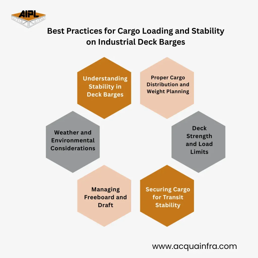 Heavy cargo should be placed near the barge’s centerline and evenly distributed longitudinally to maintain optimal stability.